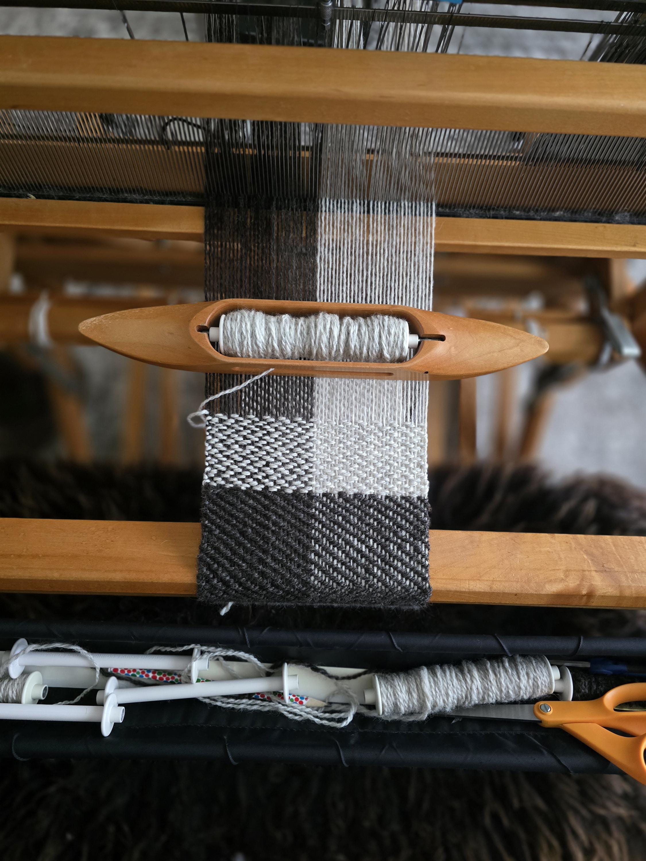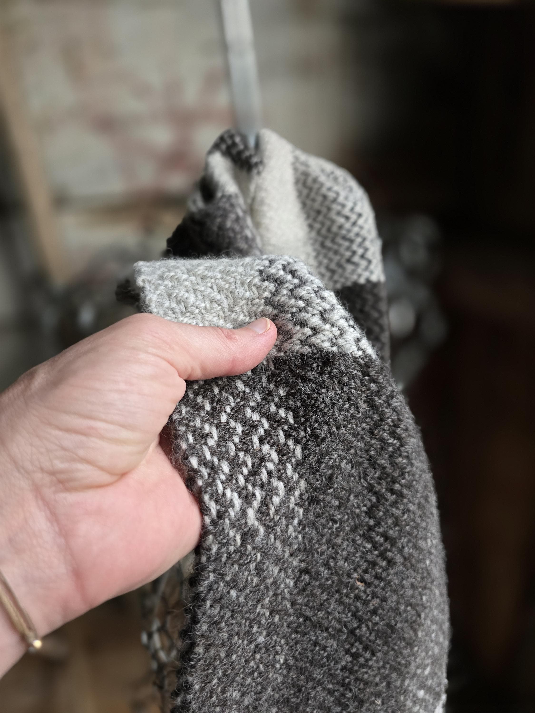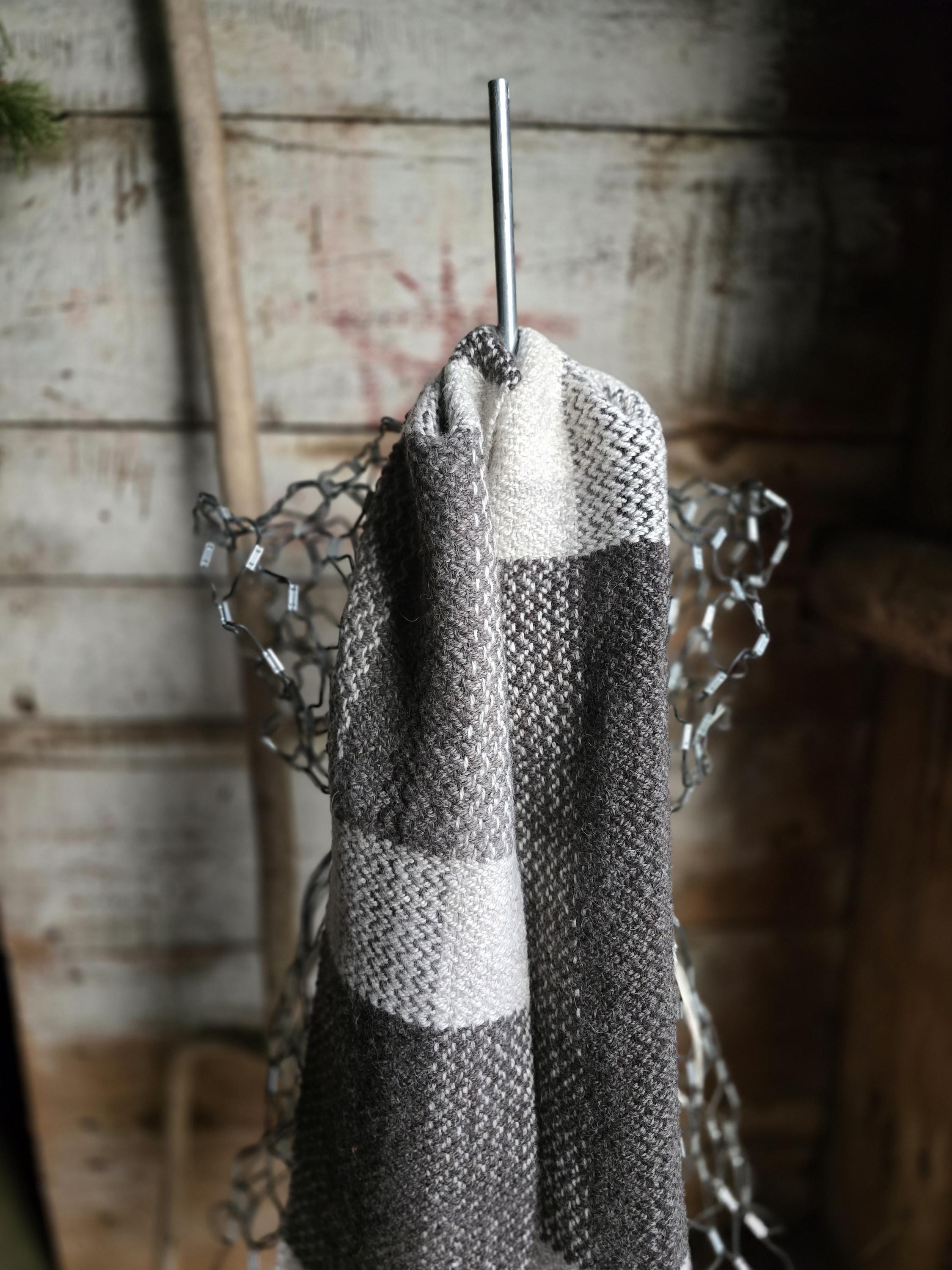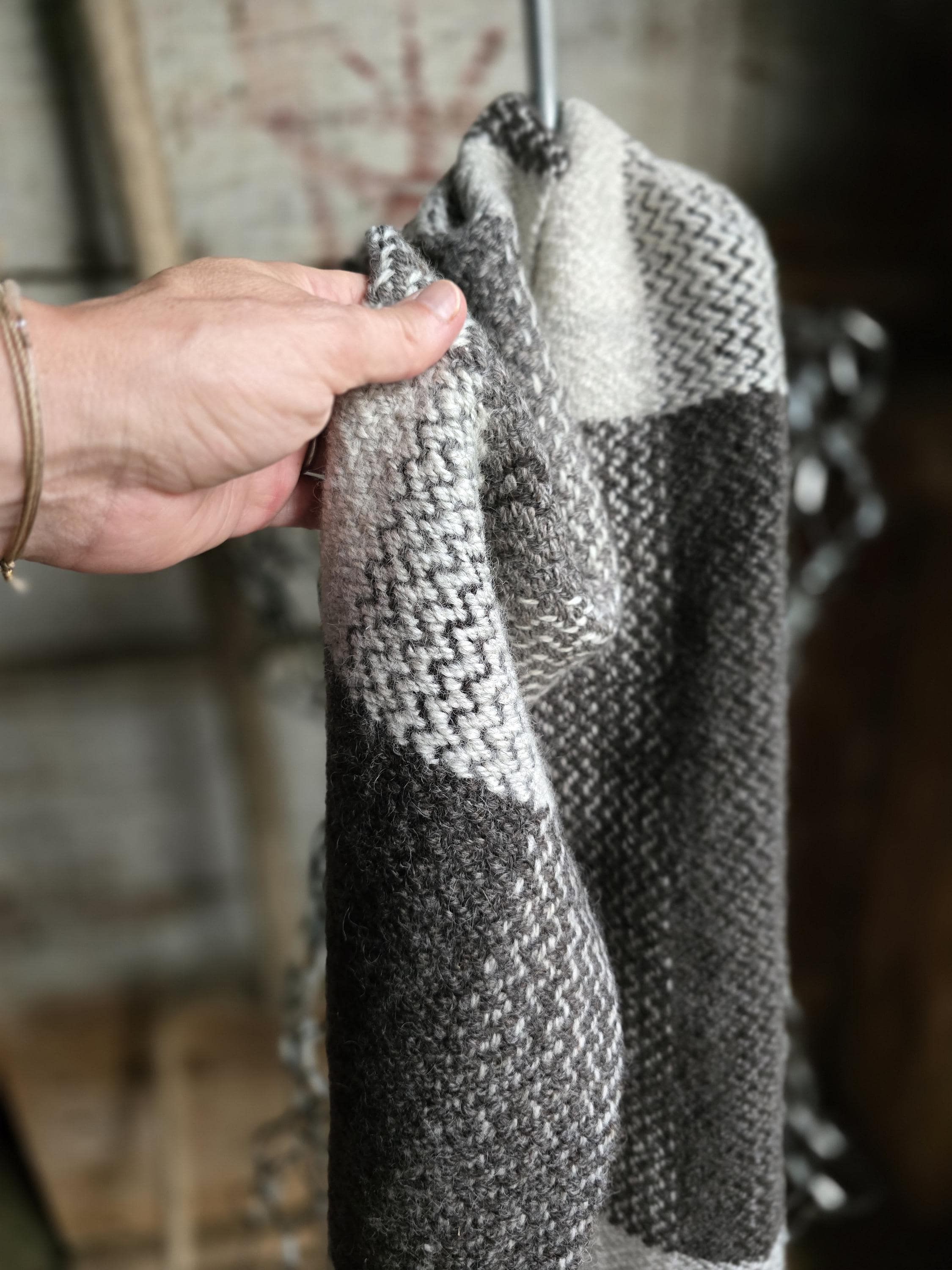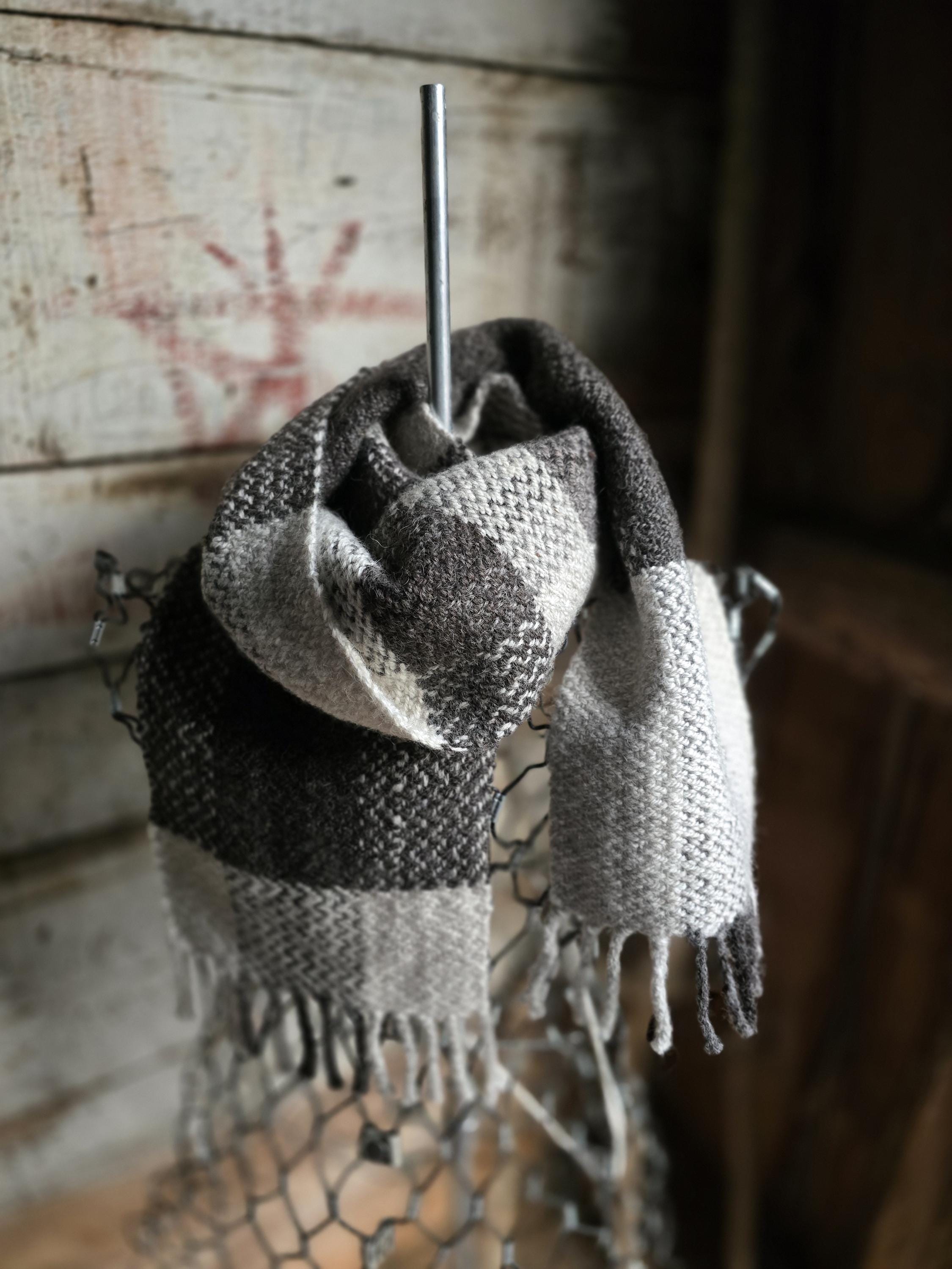 Handwoven right here on the farm this scarf represents our Shetland sheep. Woven in naturally creams, black and grays.