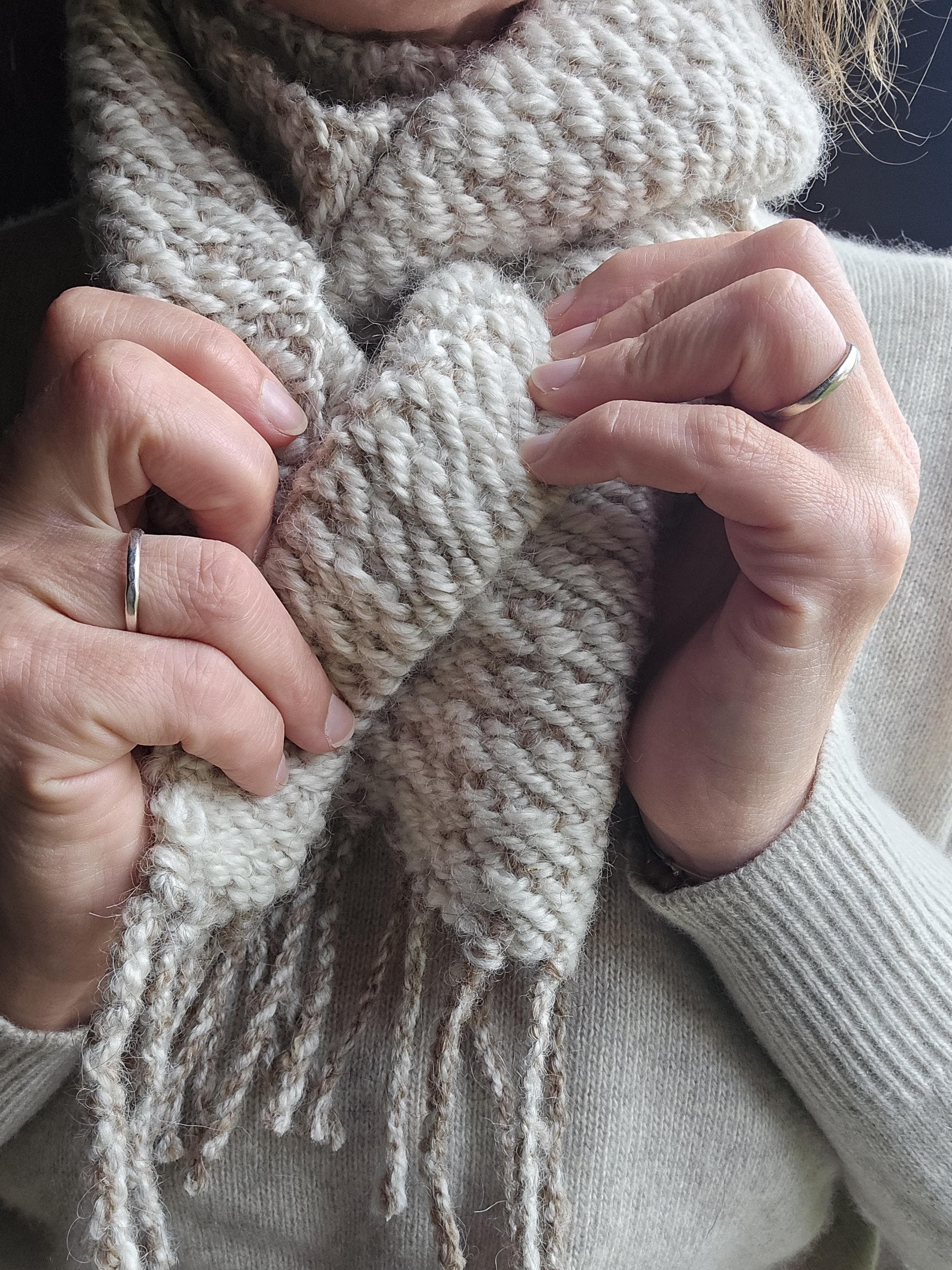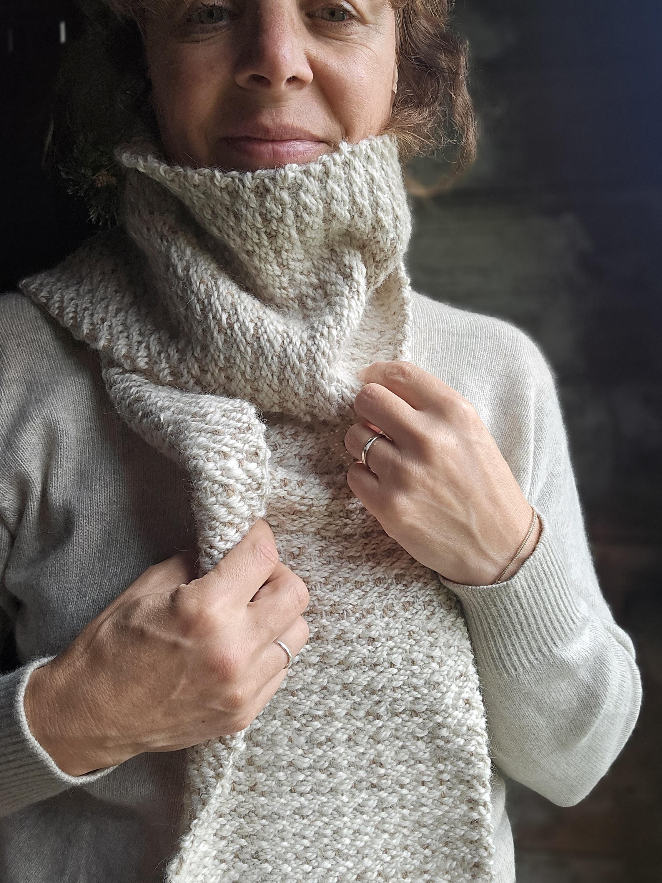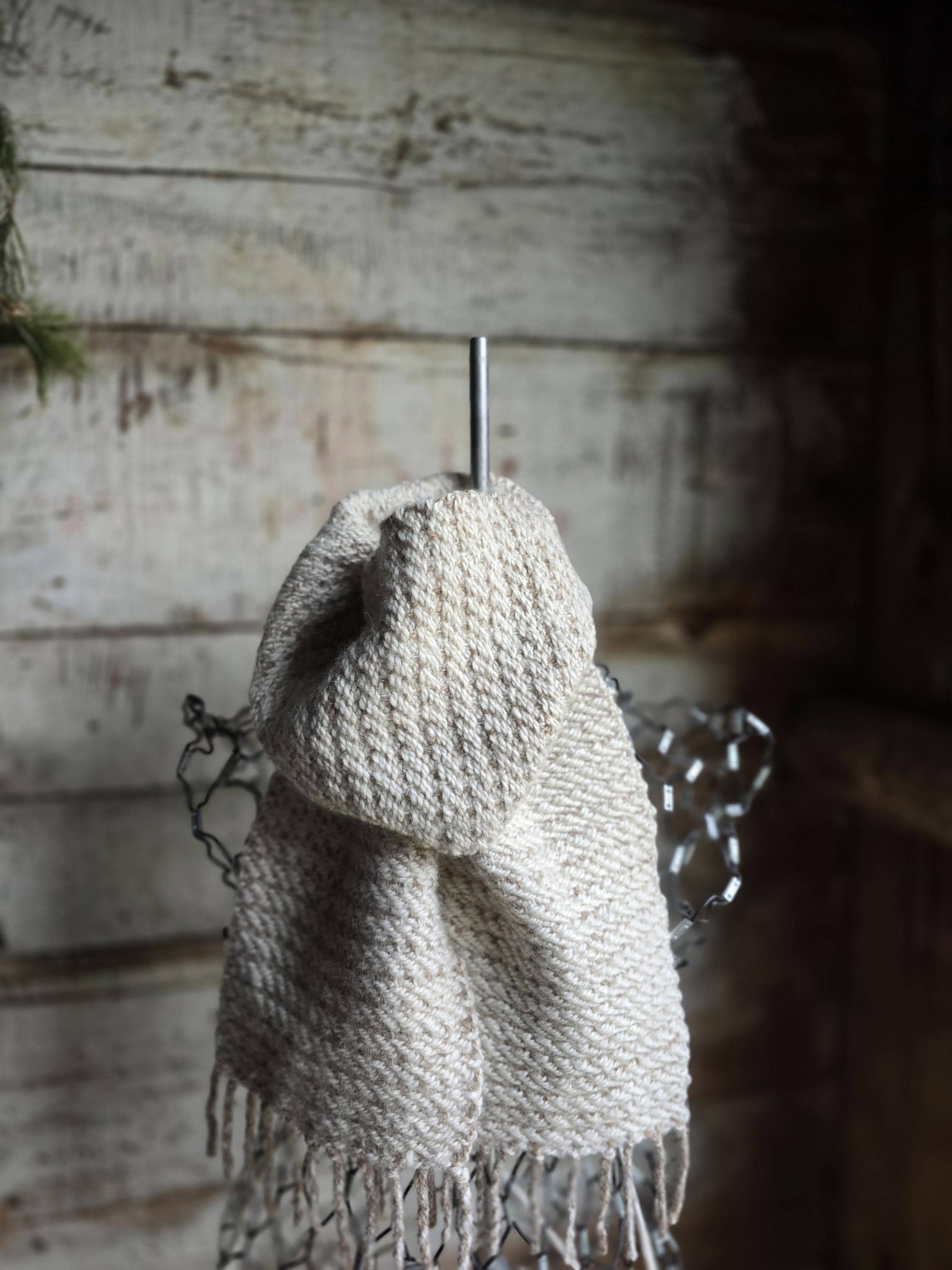 Handwoven right here on the farm this scarf represents our creamy Shetland sheep. Warped in a light beige, woven with a creamy white weft. This scarf has that squish factor!!